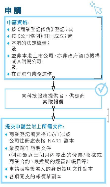 資助範圍 : 計劃涵蓋12類有助遙距營商的資訊科技方案,以支援企業在疫情期間繼續營運和提供服務。